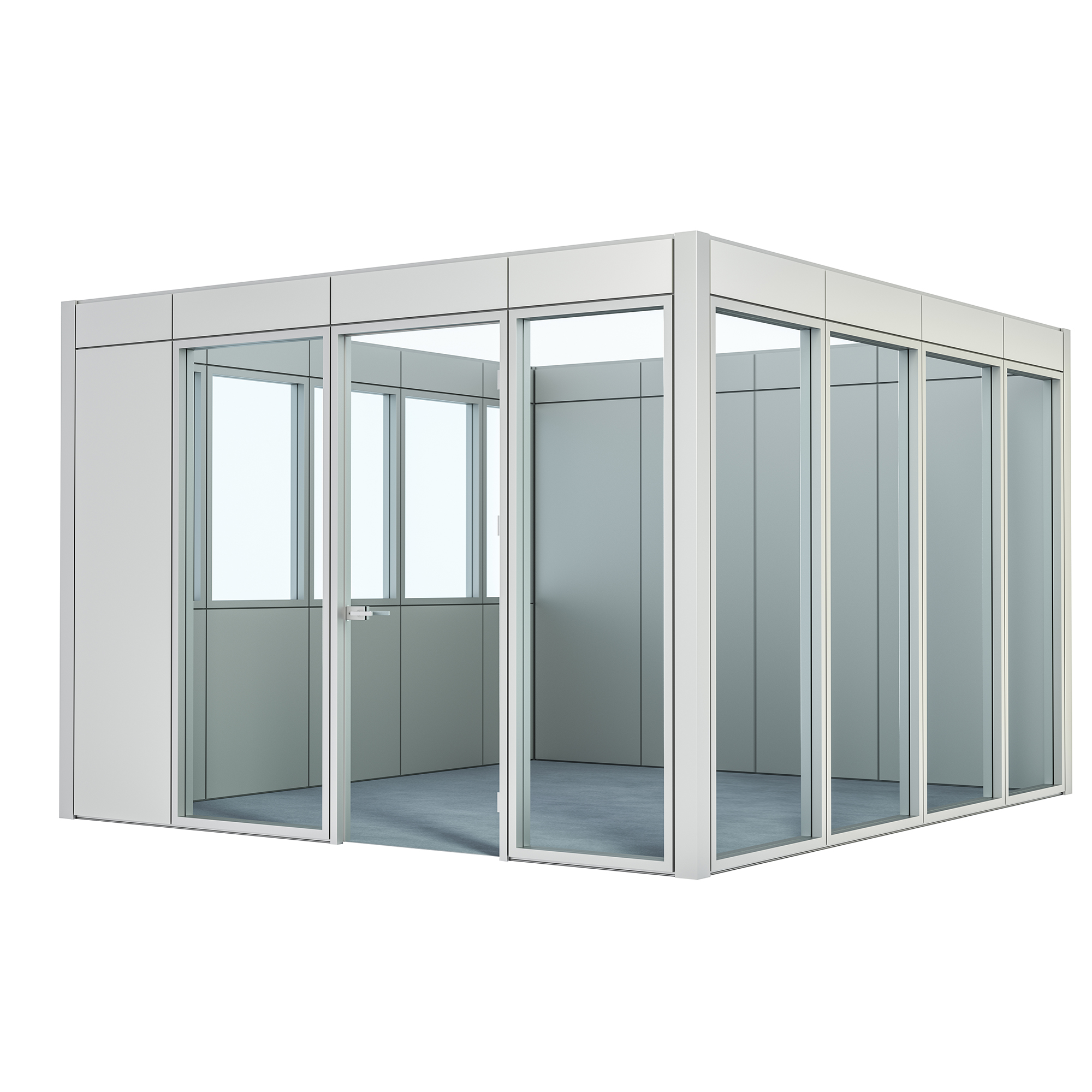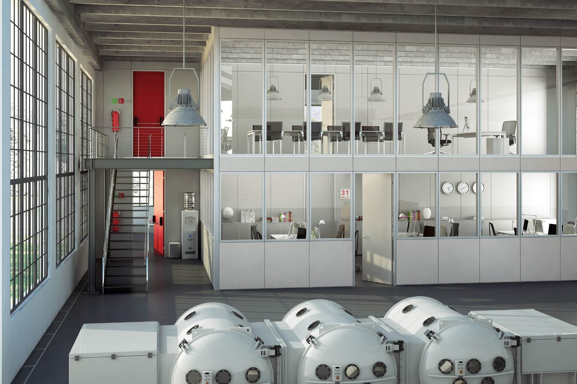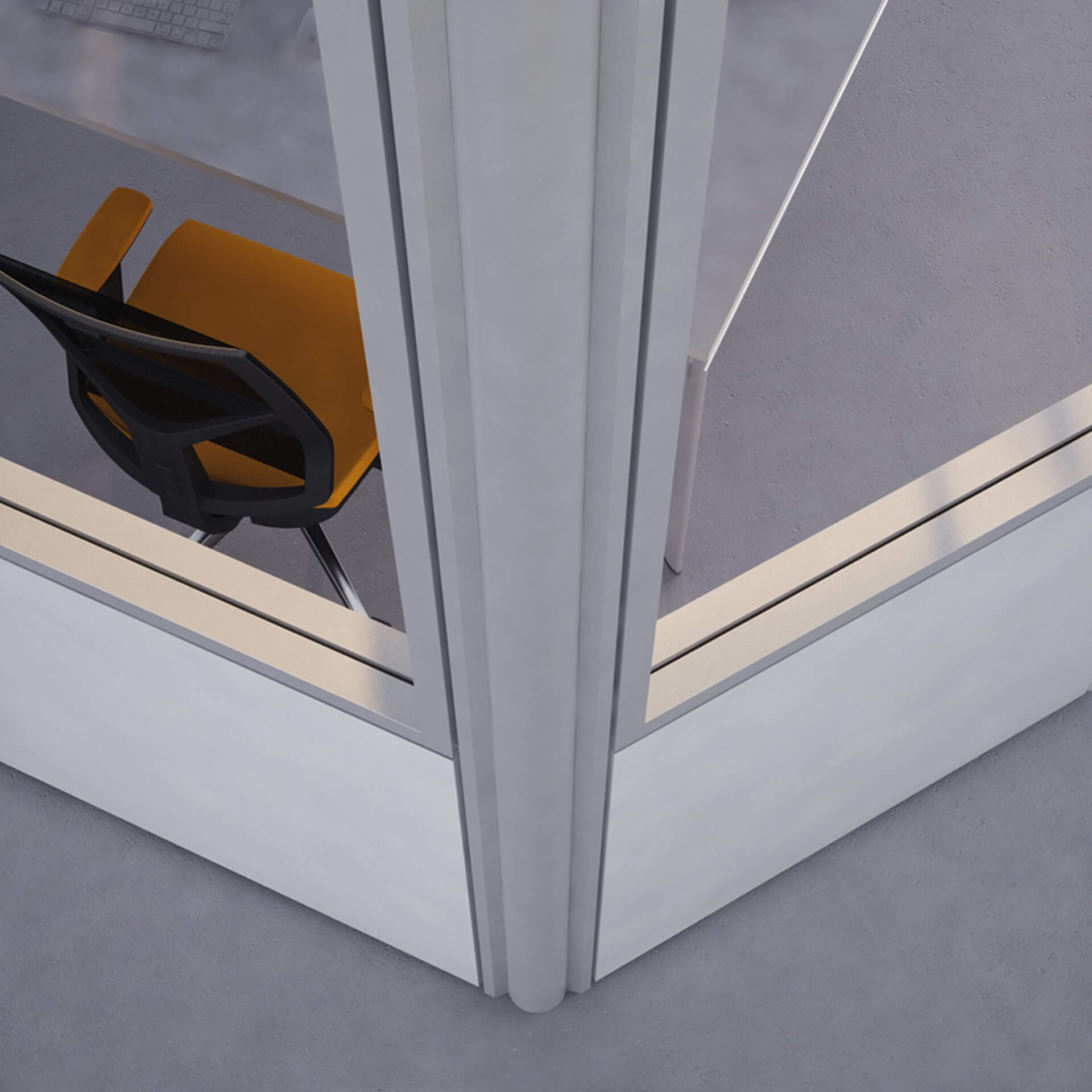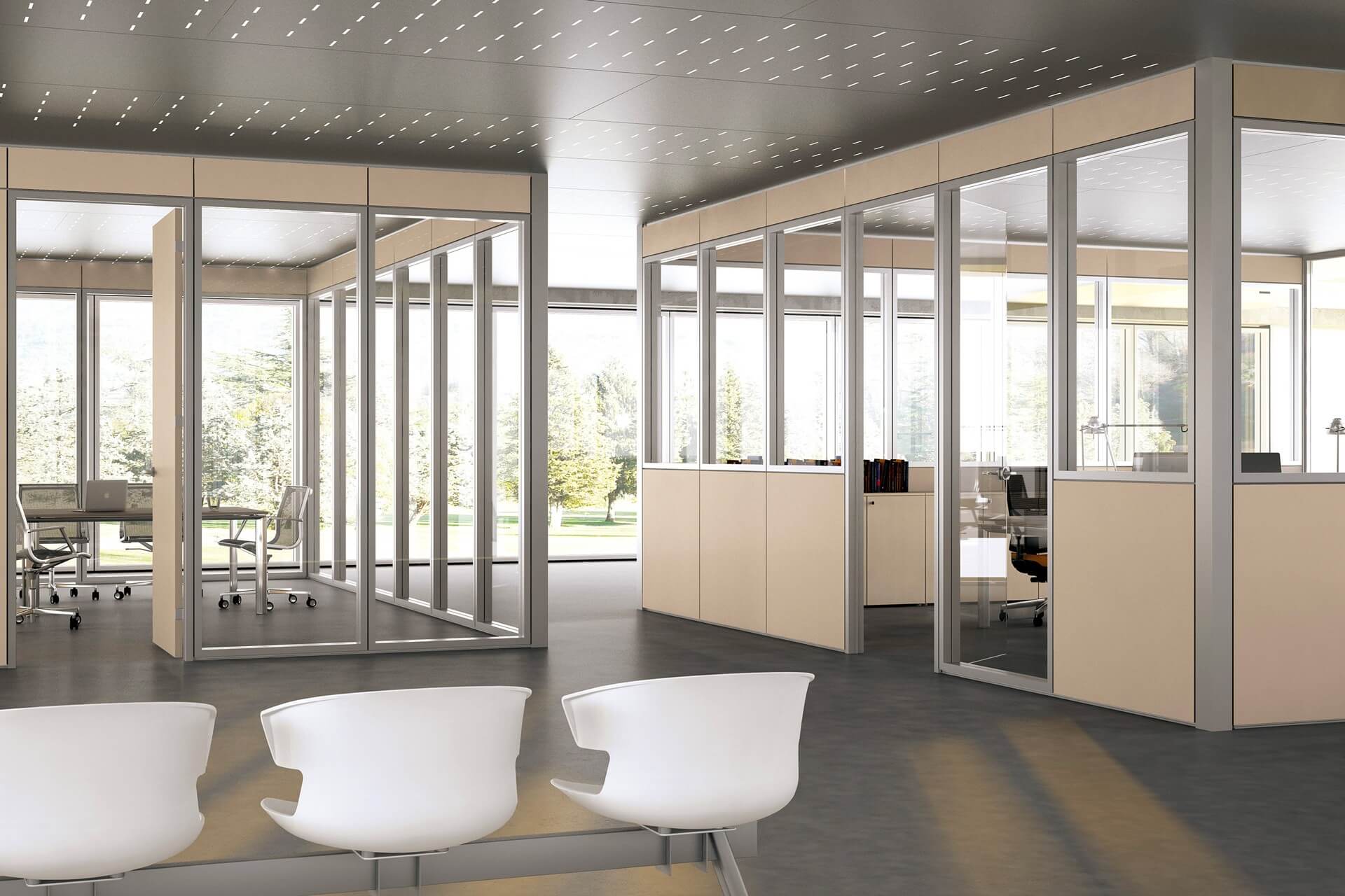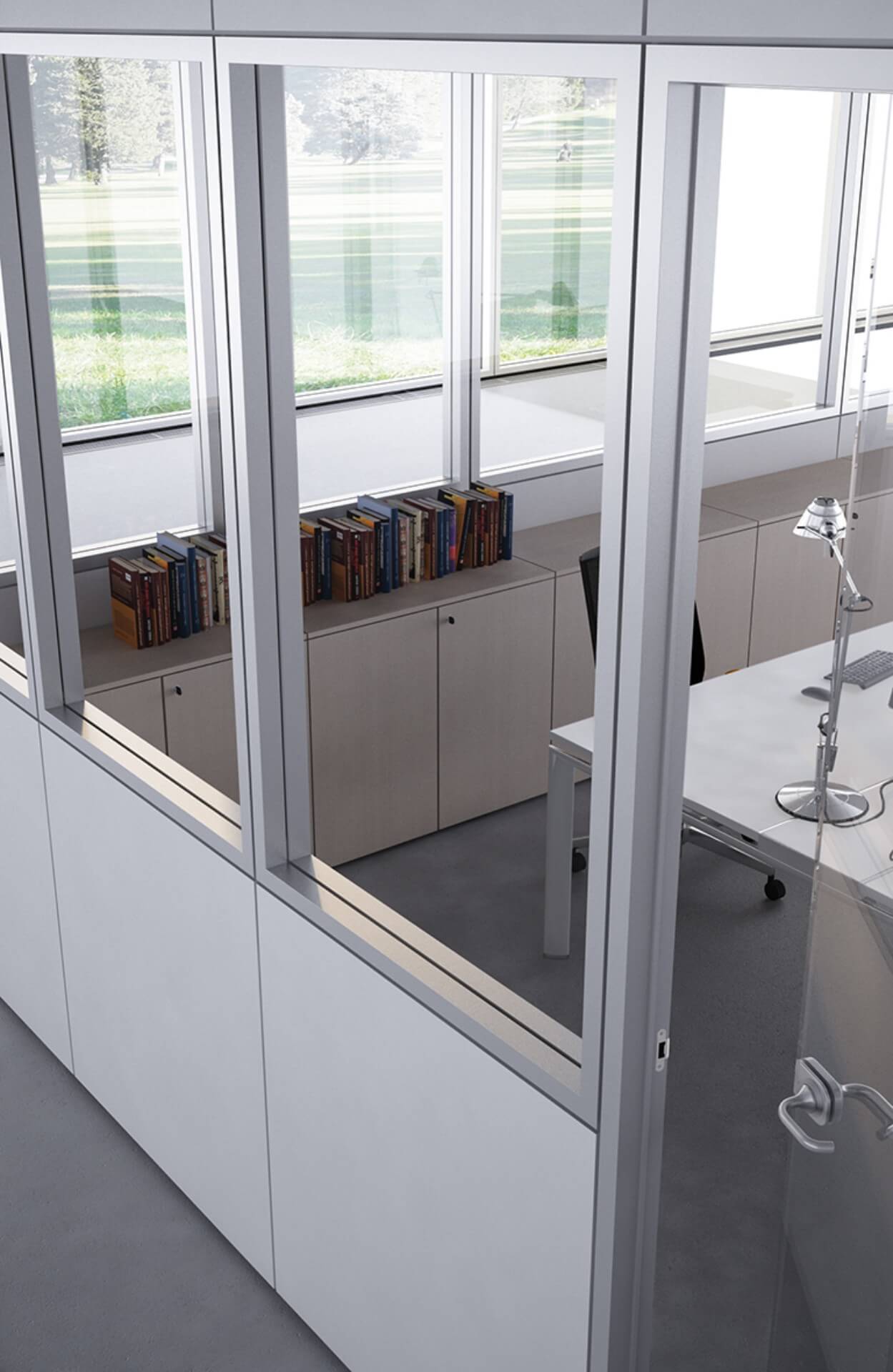 Prima Box partition wall consists of an internal aluminum structure, blind parts with faced chipboard panels and glass and aluminum glazed parts.