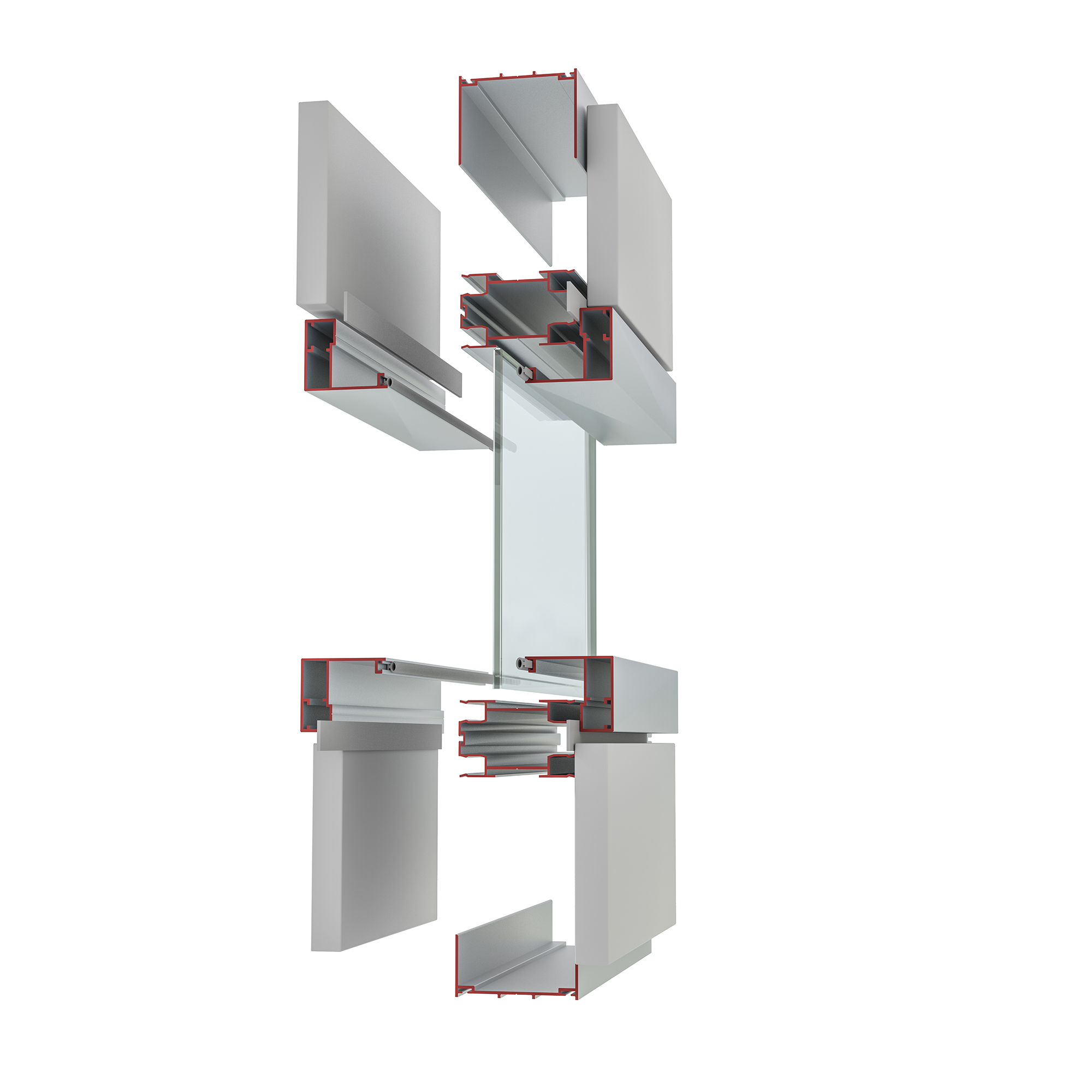 The blind modules are made with 18 mm thick faced chipboard panels with standard finishes, edged with 1 mm thick ABS edge, matching the panel finish. The glazed parts are made of extruded aluminum profiles with a silver anodised section or painted in RAL colors on request, while the glass, both single and double, is stratified 3 + 3 pvb. 0.38 safety as required by the regulations.