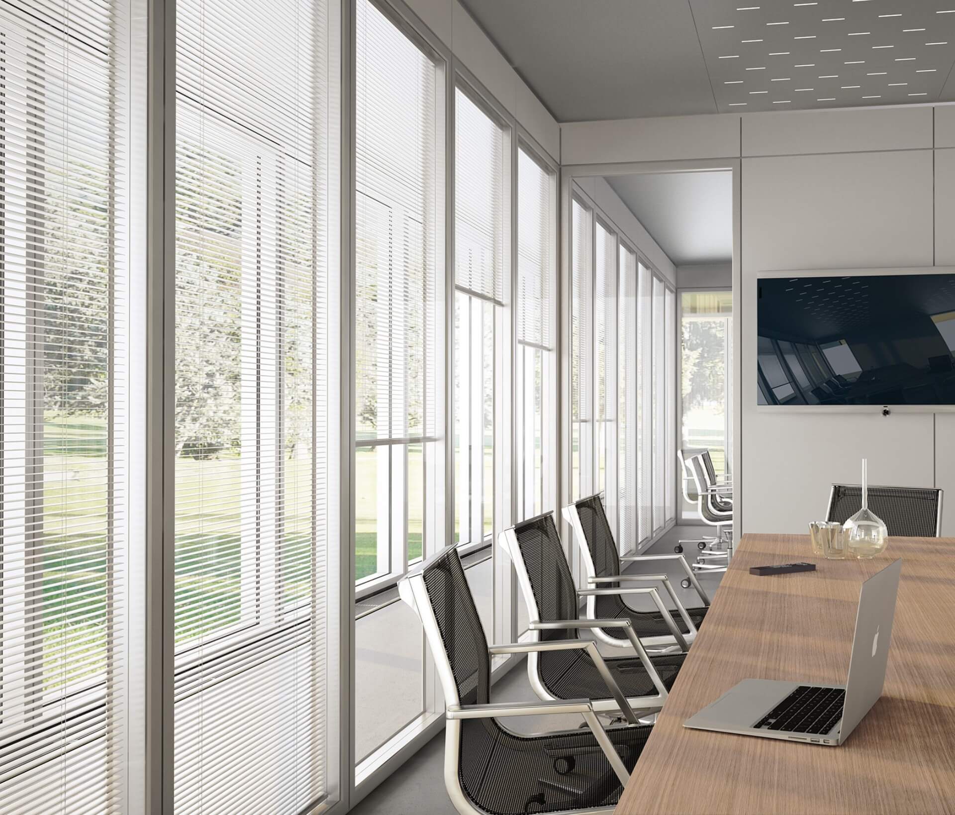 Possibility to insert Venetian blinds between the double glazing of the wall, with 15 or 25 mm slats and orientation only control. Any wiring for small systems is located inside the wall: data, telephone or electric lines. It is possible to insert mineral fiber mats of various thicknesses and densities inside the blind parts in order to increase the soundproofing features of PRIMA BOX walls.