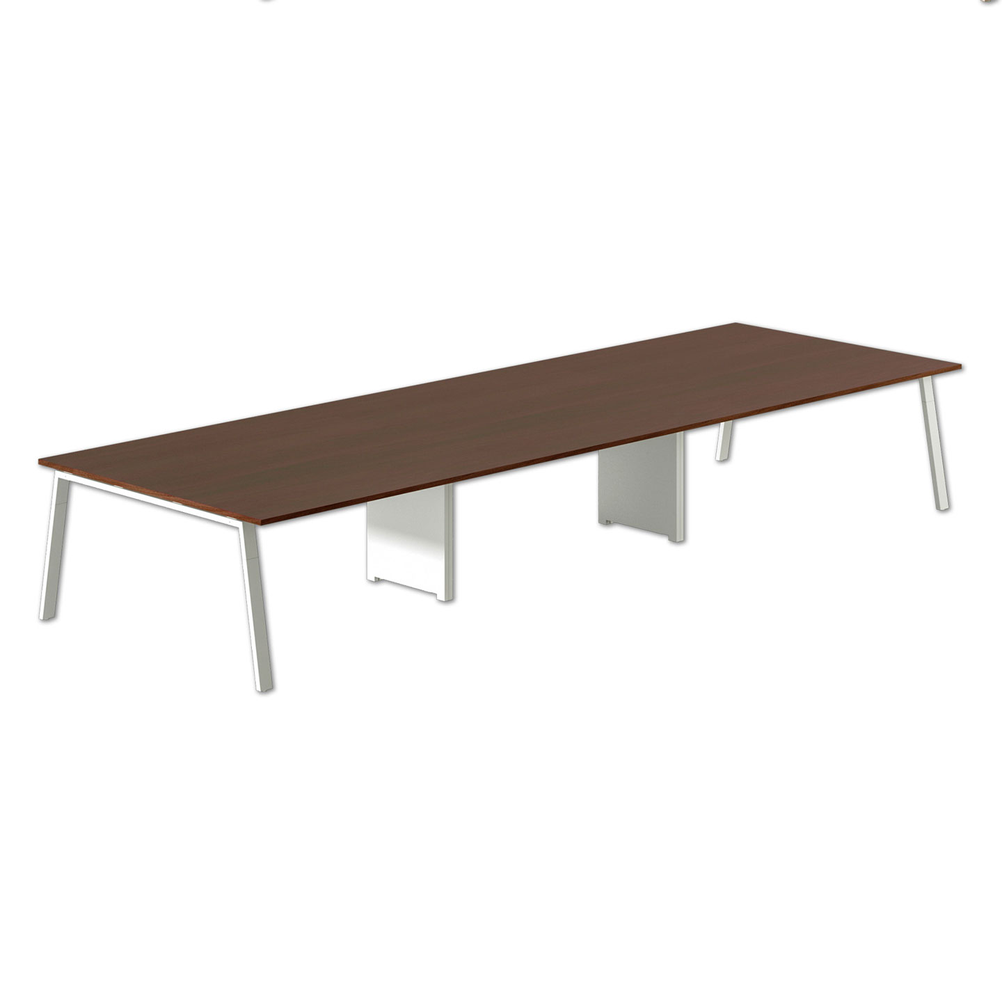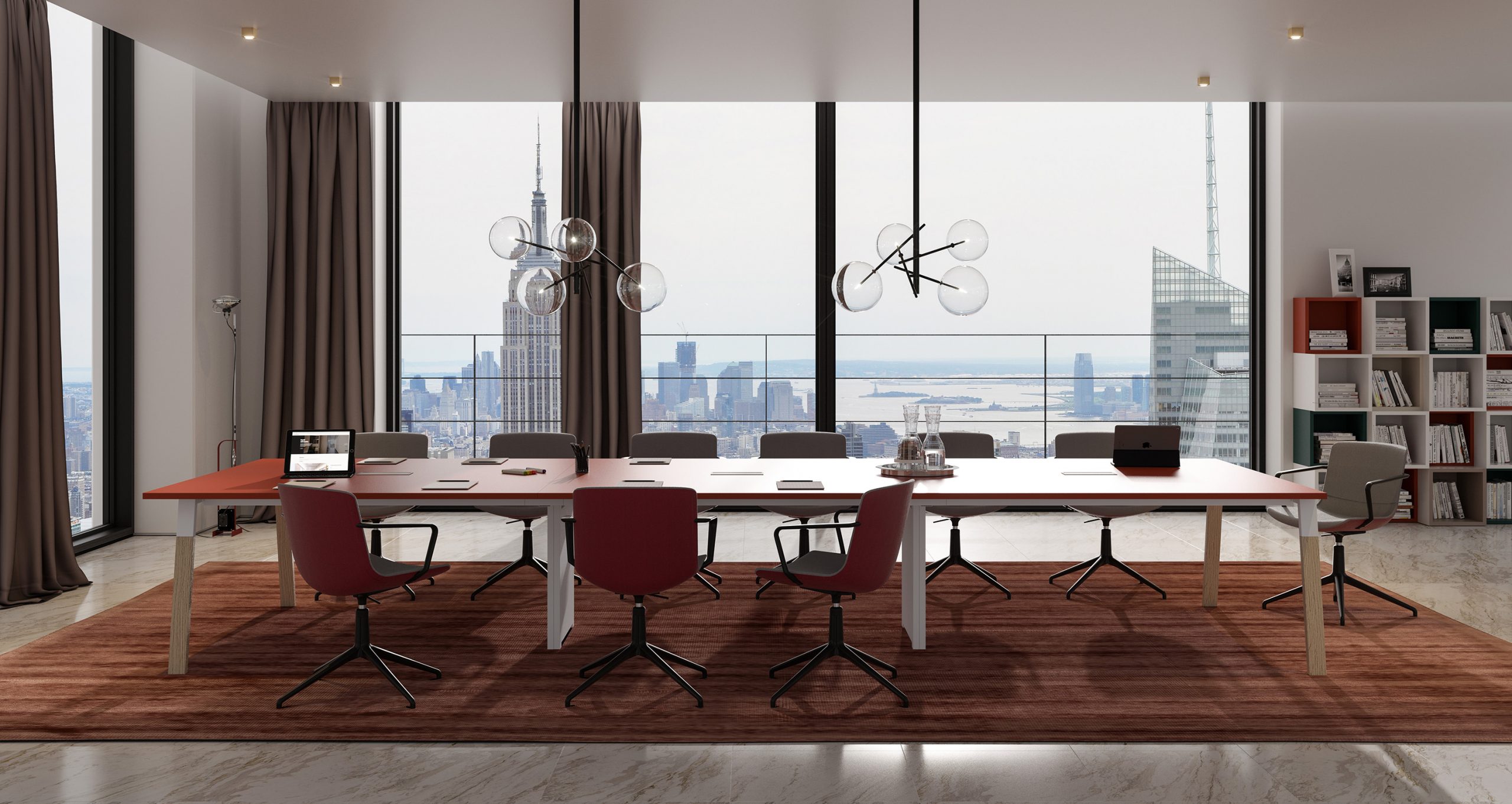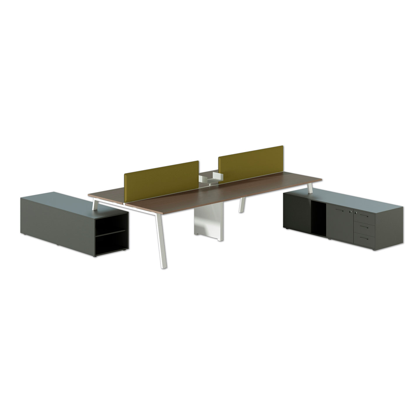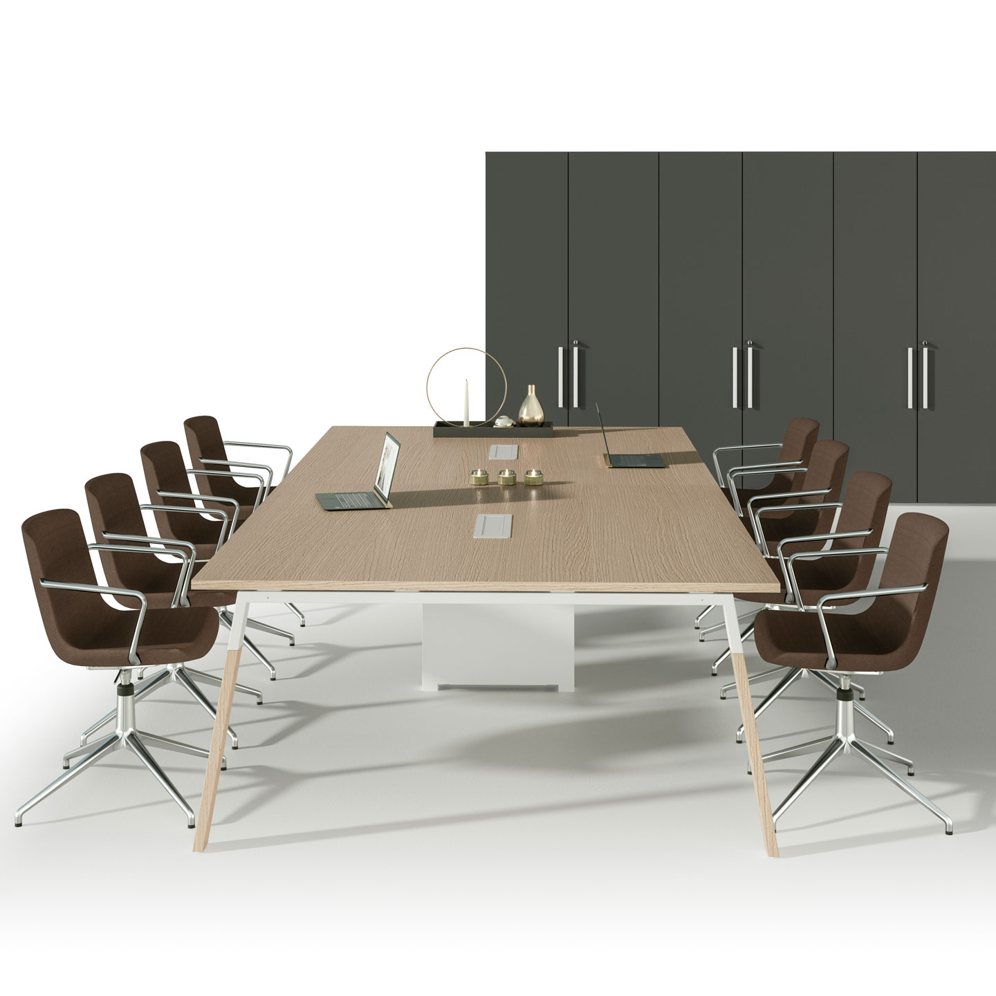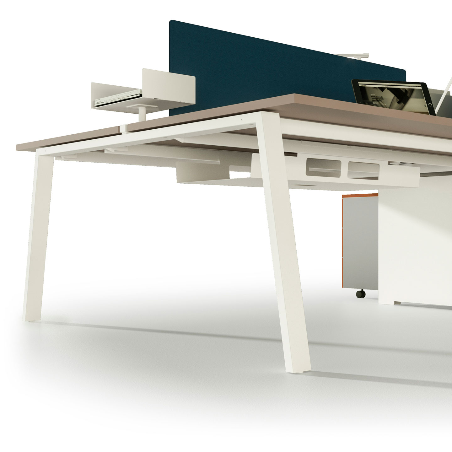 The workstation desk system also includes a range of designer meeting tables. In this case, the central leg can be equipped with a cable riser, an essential solution for routing cables neatly and keeping the workspace perfectly organized.