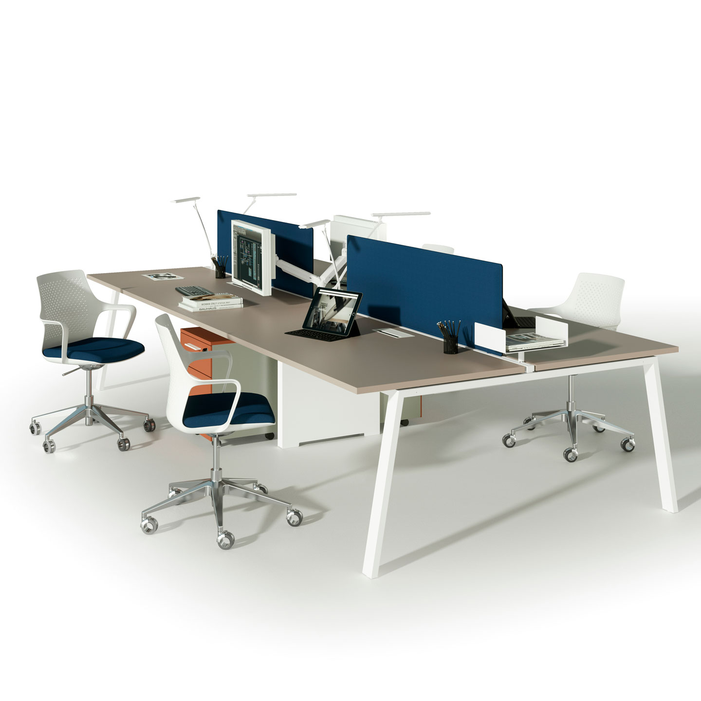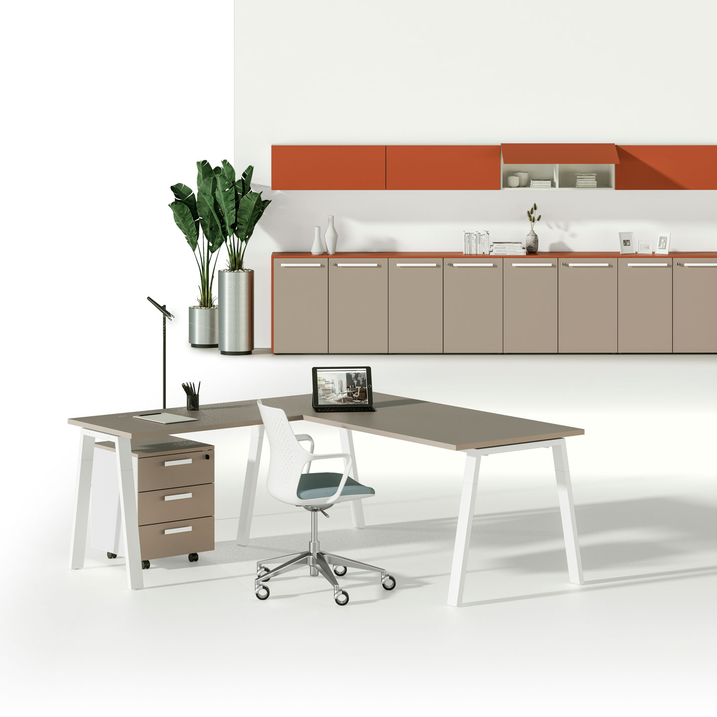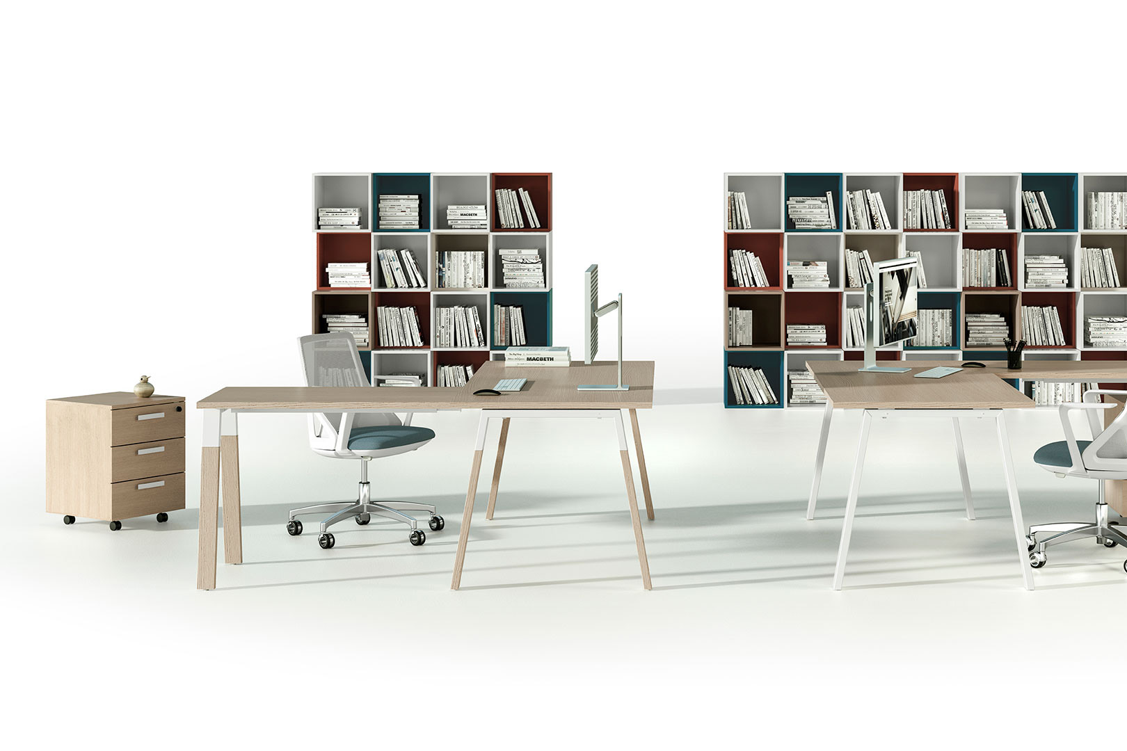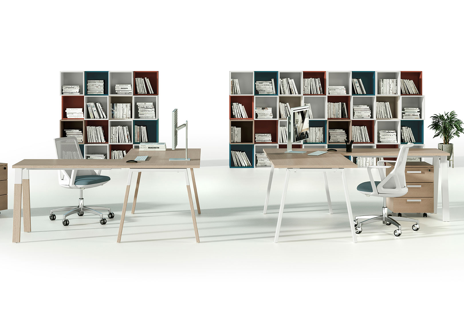 The ALPHA desks feature a distinctive trestle-style metal leg, available in metal or with a light oak solid wood insert in the ALPHA WOOD version, designed to make every workspace unique.