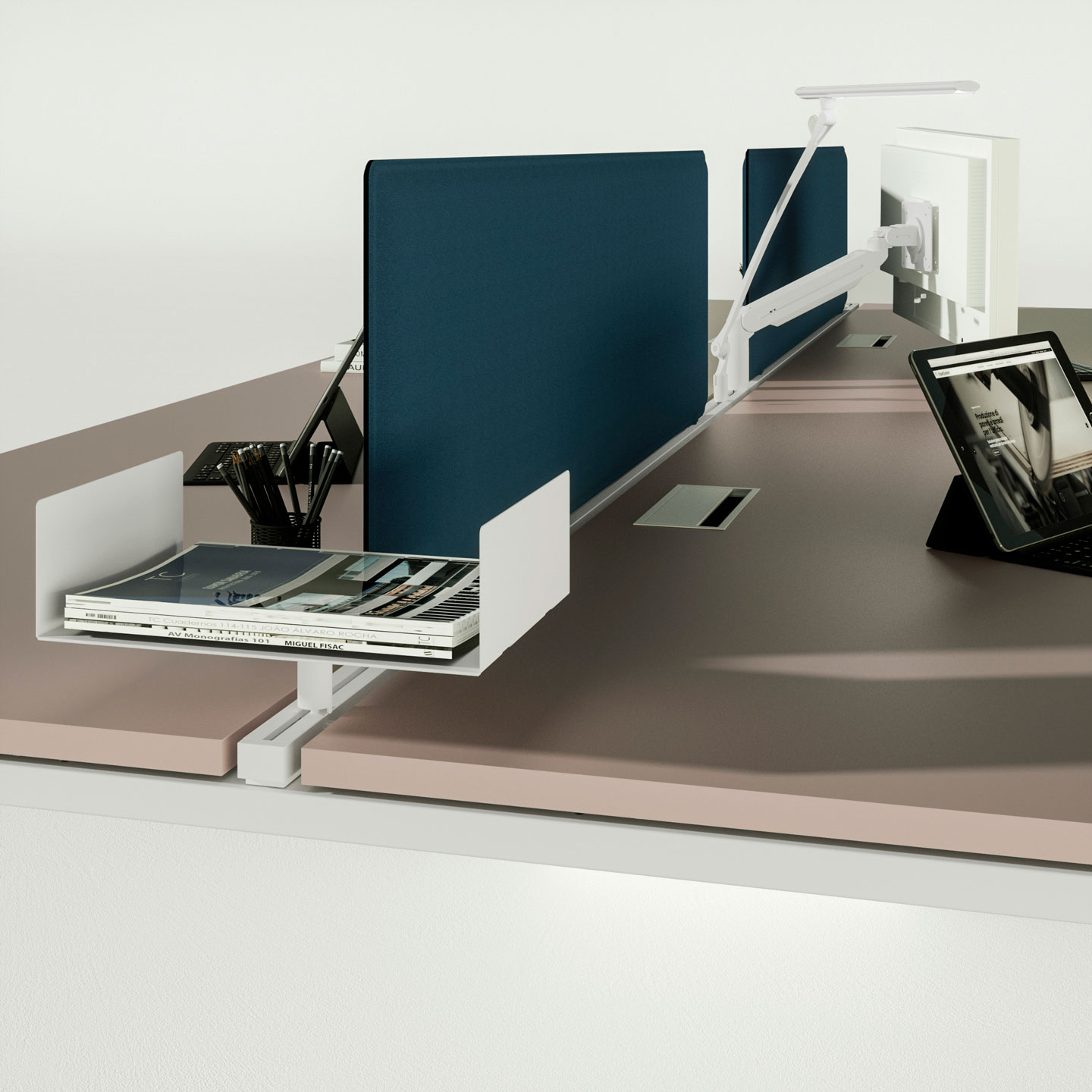 Shared workstations can be enhanced with a wide range of accessories that integrate with the central rail system. Cable outlets, top access units, electrification accessories, cable trays, cable vertebrae, CPU holders, and screen panels allow users to customize their workspace according to their needs.