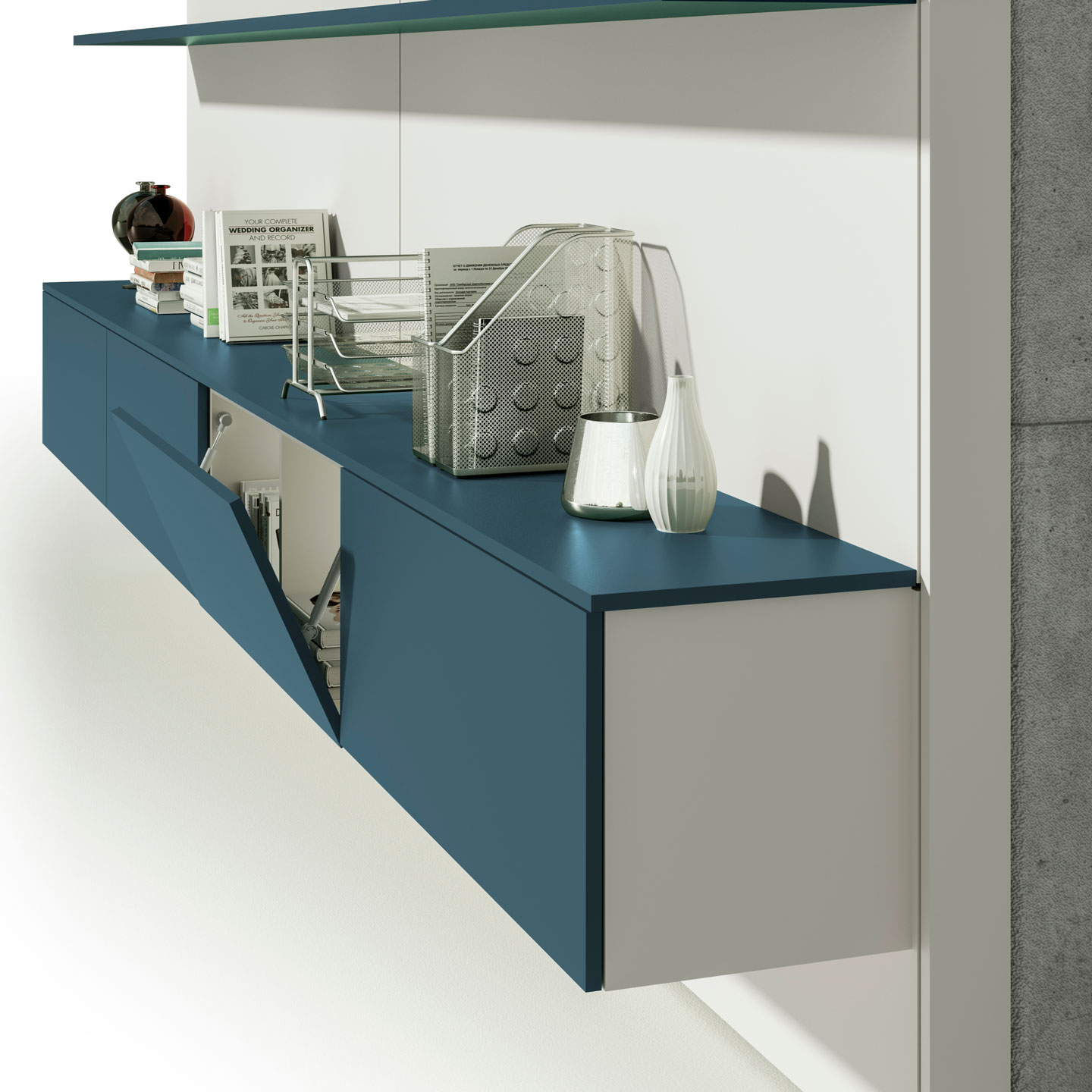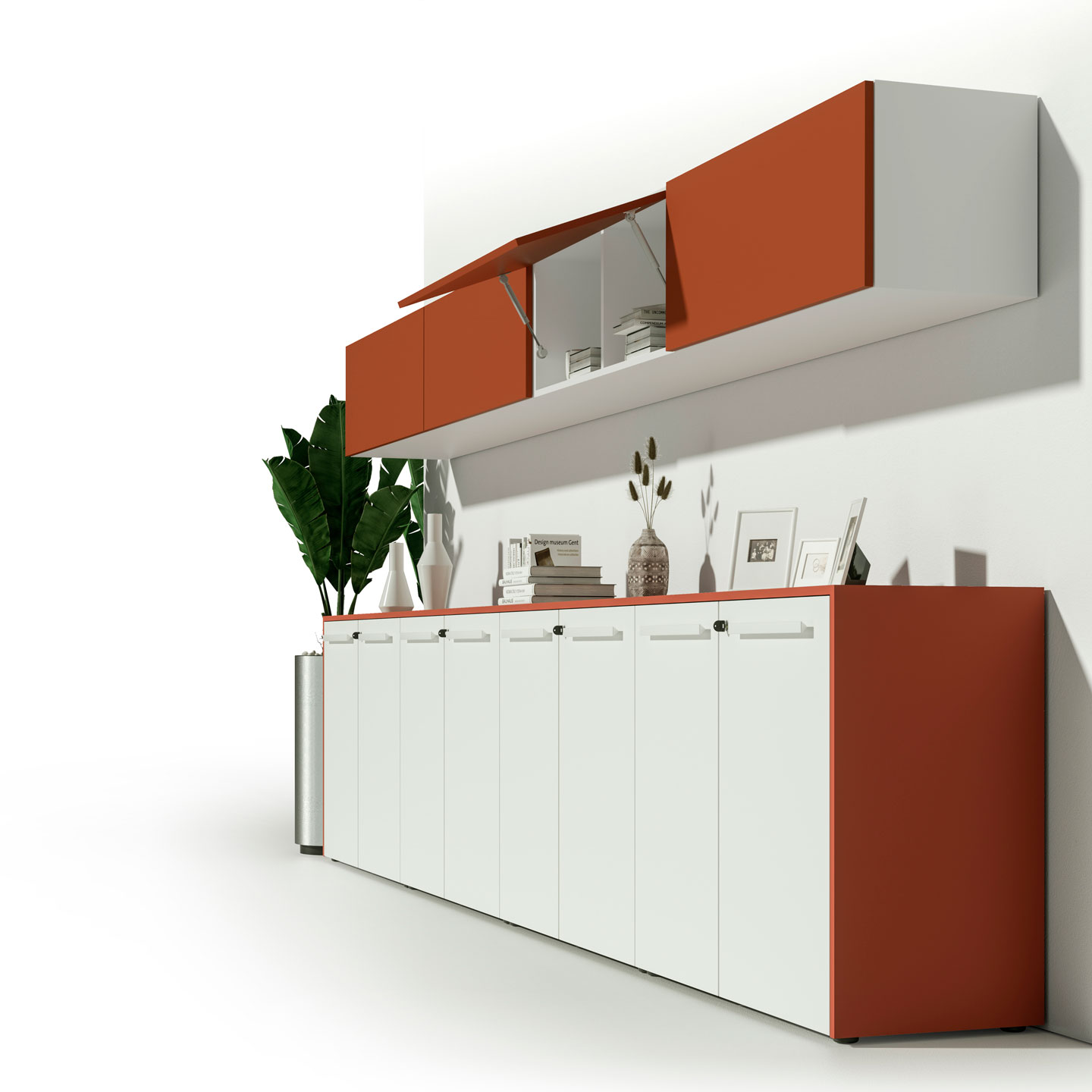 The sides and back panels are 18 mm thick, while the doors are equipped with a push-pull opening mechanism and flush hinges that allow a 90° opening, either flap-down or tilt-up. Our wall units include everything required for easy installation in any office environment. Doors and structures are available in matching finishes.