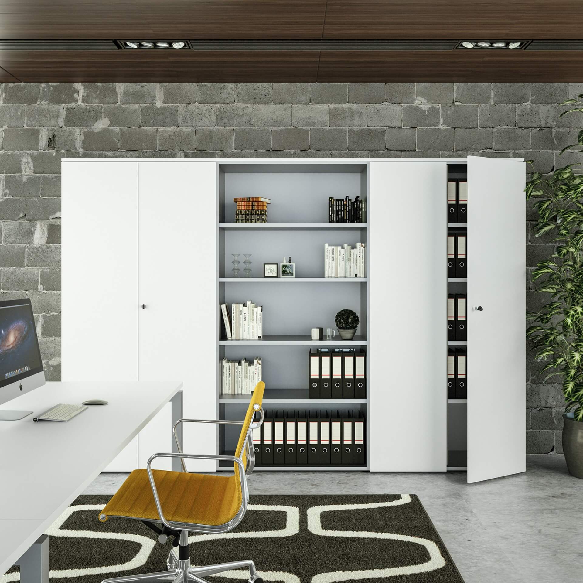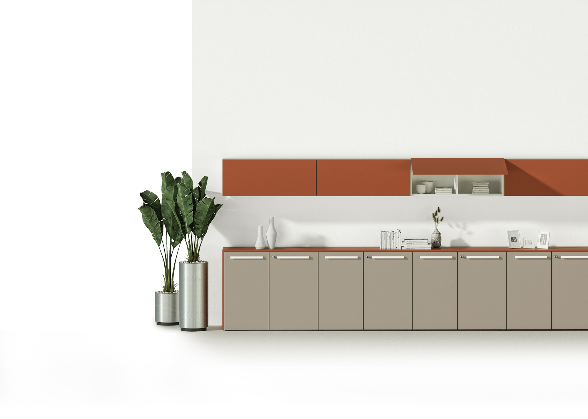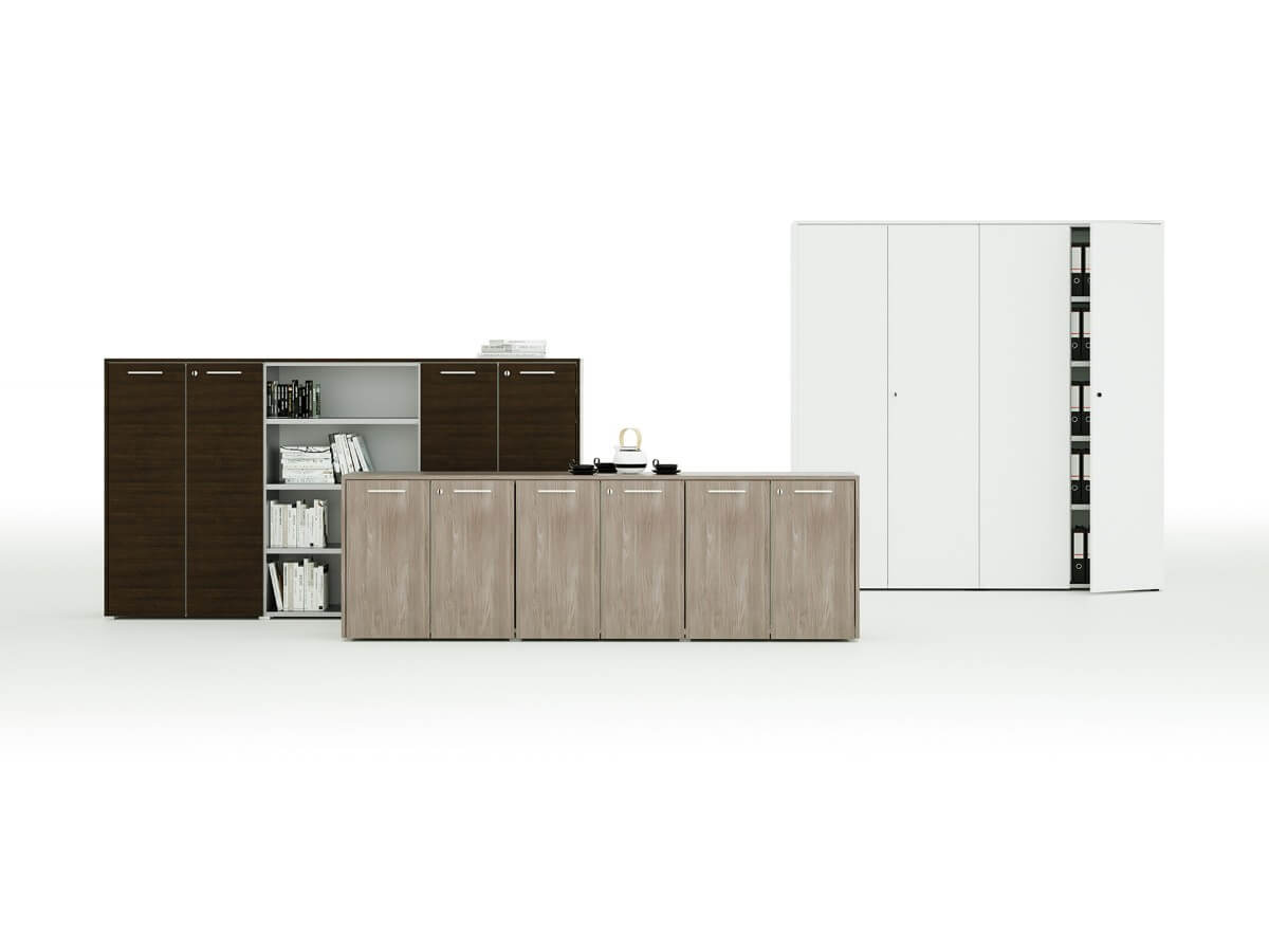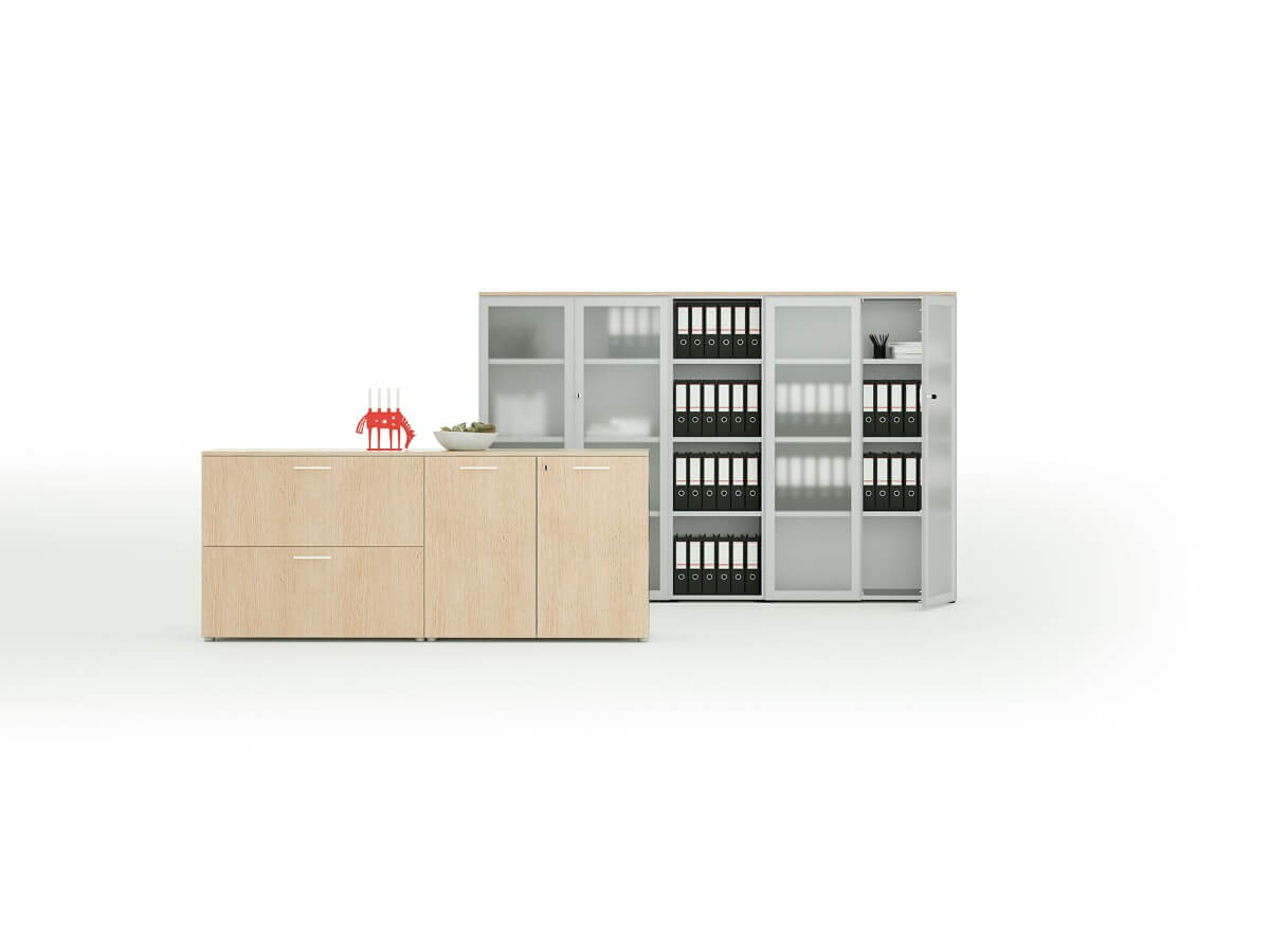 “Space” standard containers, made with a silver finish melamine chipboard structure, edged on all sides with 1 mm thick ABS edge. Finishing tops and doors are made of melamine chipboard with a finish choice between white, ivory, gray, silver, light oak, gray oak, wengè and maple. The structure of the container consists of 18 mm thick sides and backs, while the base has a thickness of 22 mm. The standard shelves are made of metal. The doors can be either blind or glazed: