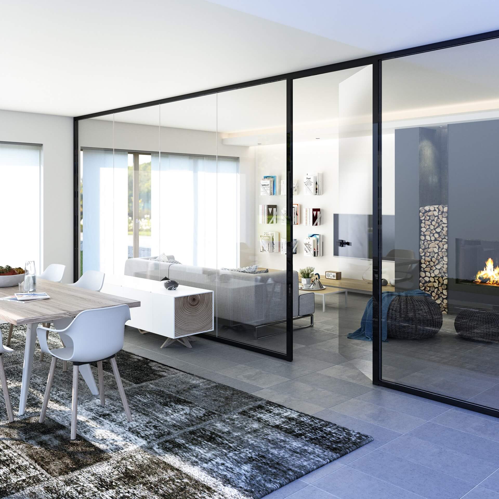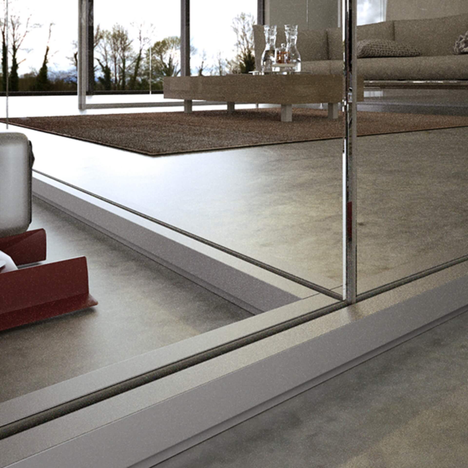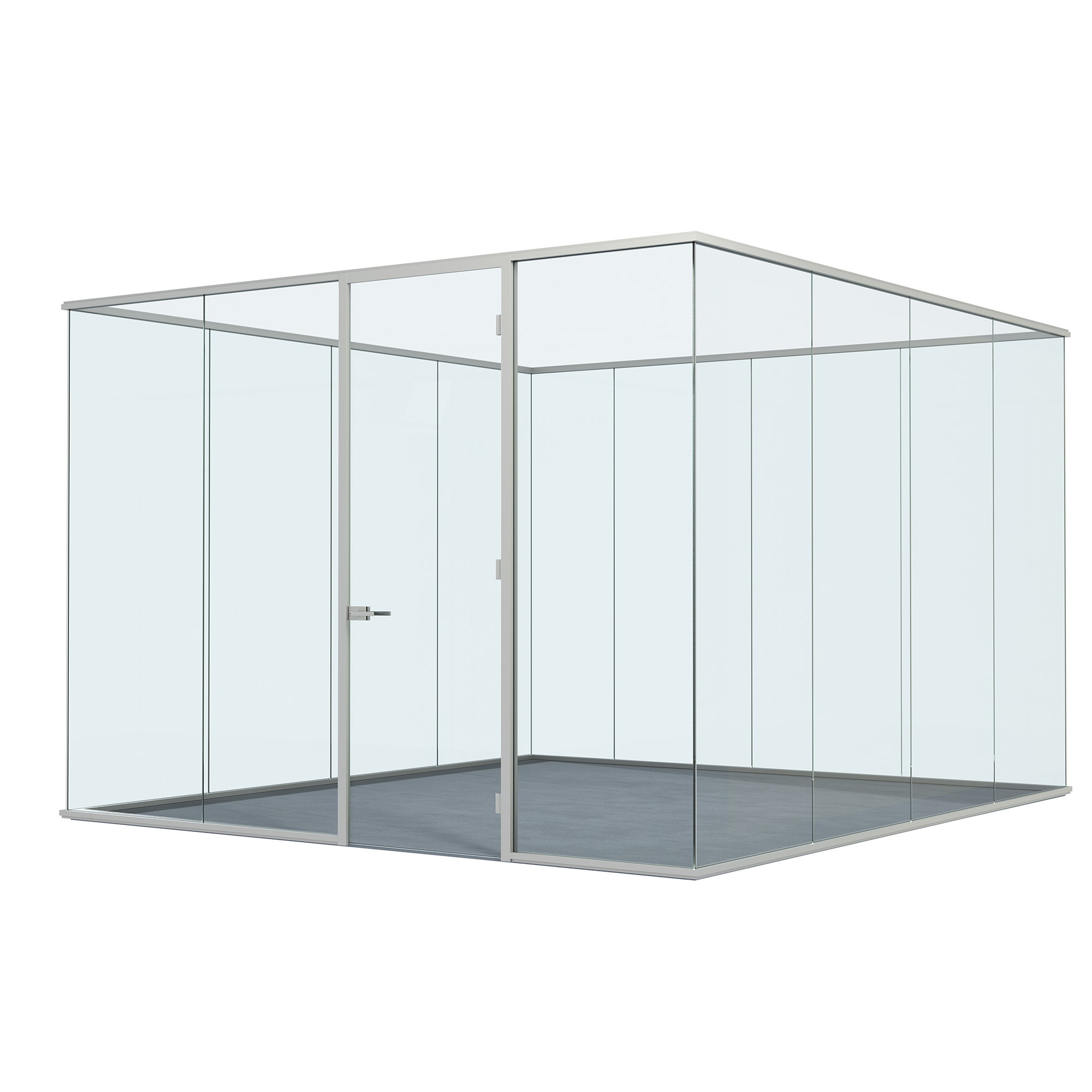 Version with both floor and ceiling profiles with section d.55 x h. 40 mm with glass adjustment of about 20 mm; glazed parts with 10 or 12 mm thick glass. The glass joints are made with adequate transparent polycarbonate profiles. Hinged doors (both glass and wood). Essentia evo wall is a complete system that can satisfy any need.