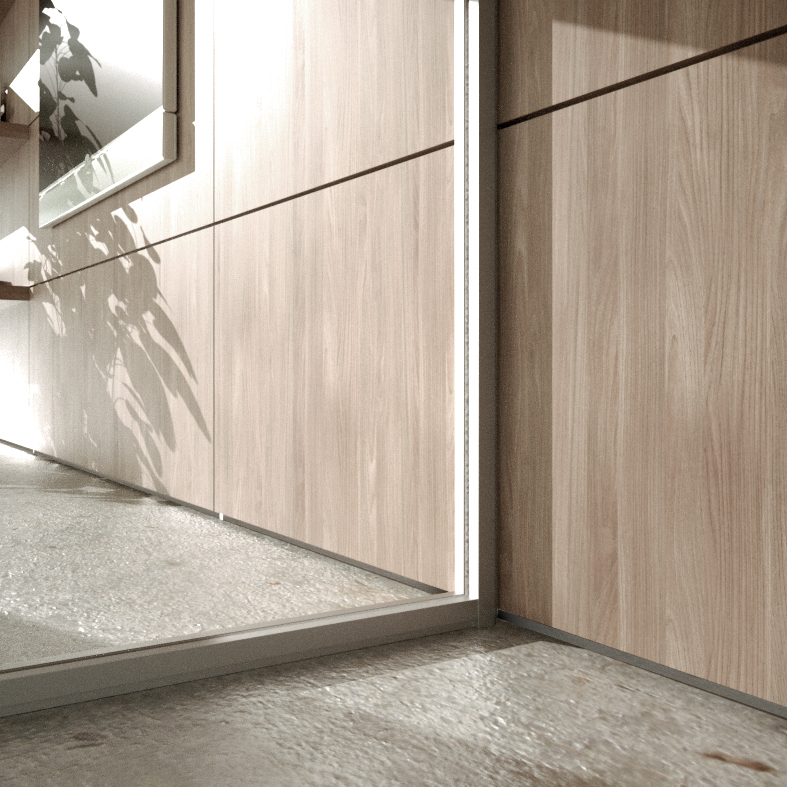 Essentia evo wall is distinguished by its minimal design. Light and resilient system, with lowered and reduced profiles maintaining an advanced technology inside, to offer more transparency and brightness. There are several solutions for the creation of the doors, with the possibility of having full-height hinges for the tempered glass doors.