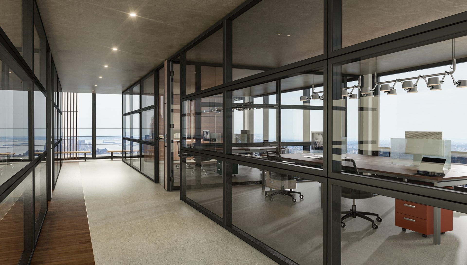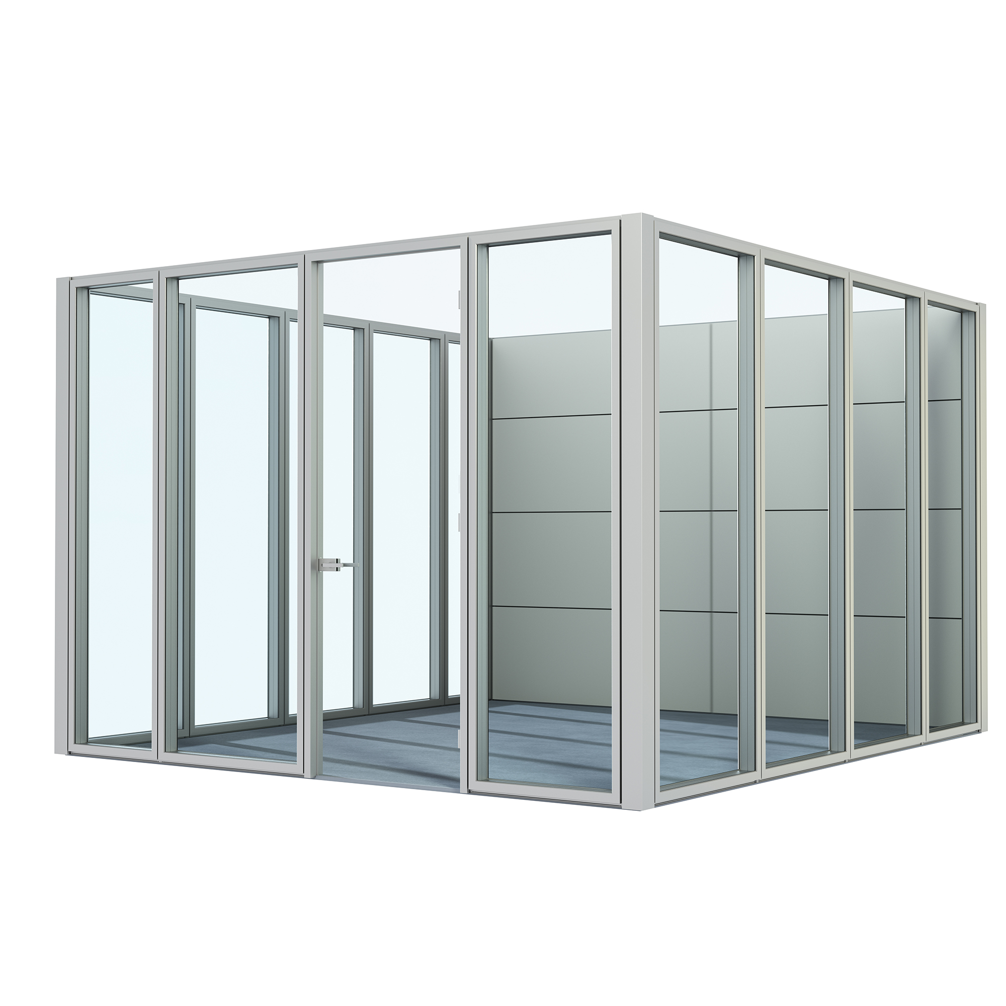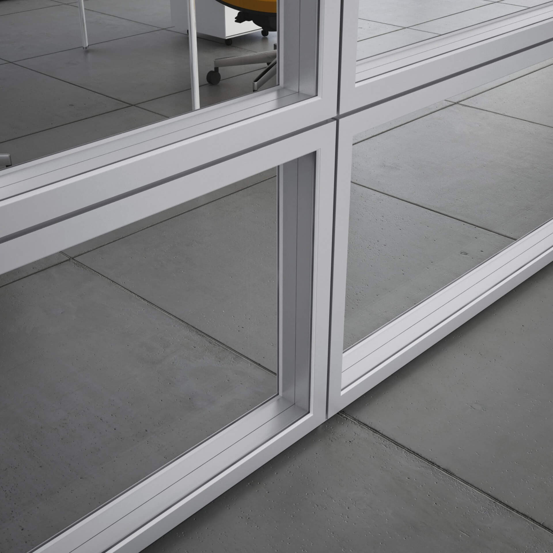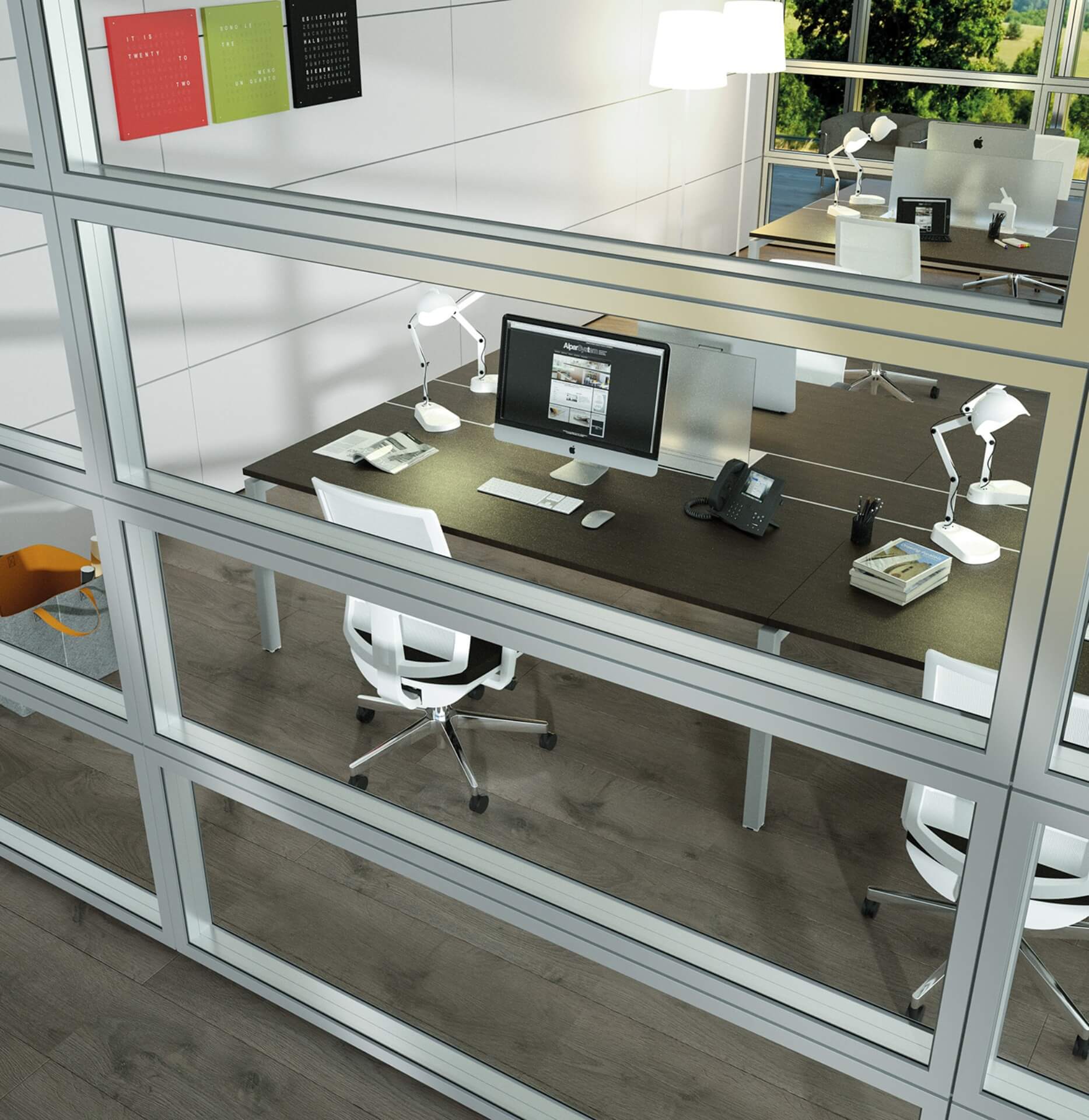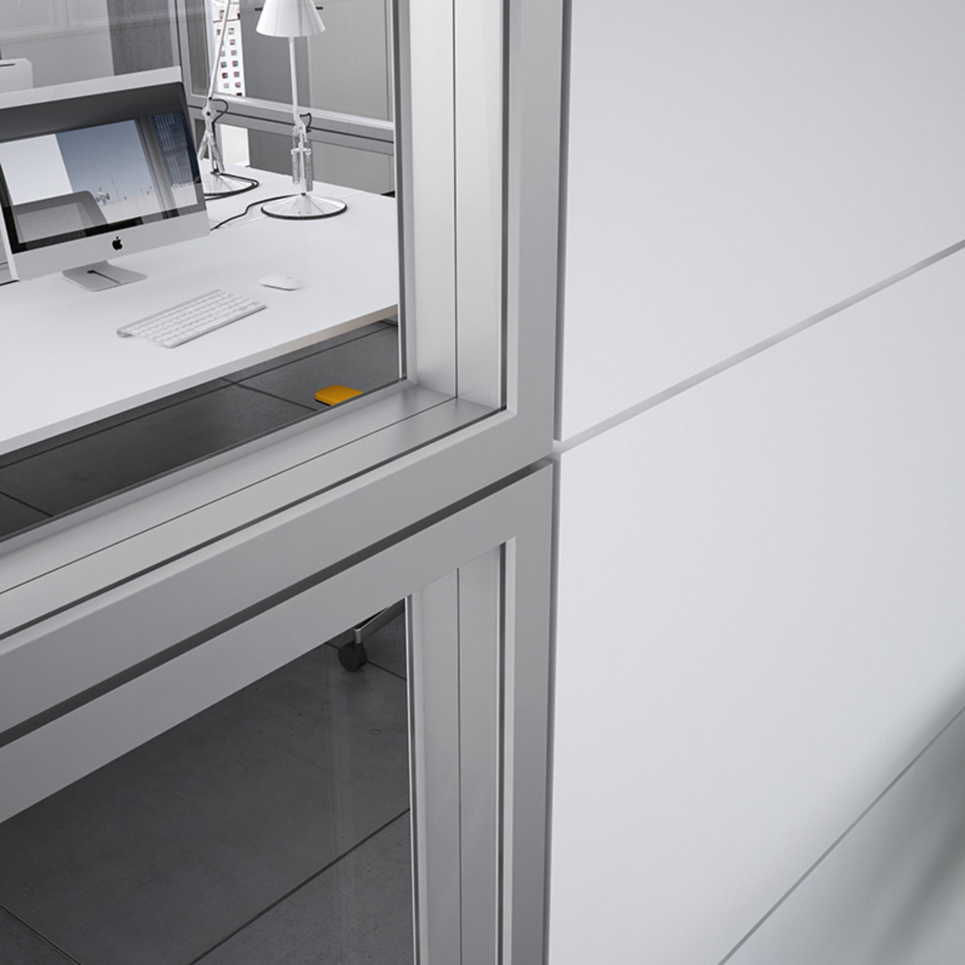 IDEA partition wall consists of an internal aluminum structure, blind parts with faced chipboard panels and glazed and aluminum glass parts. The wall structure consists of a lower telescopic current and an upper one with a U-section made of extruded anodized aluminum, aluminum uprights with grooves for pressure mounting of the clips that hook the covering elements to the structure (panels and framed glass). The uprights are connected to each other by means of crosspieces with the same profile as the upright.
