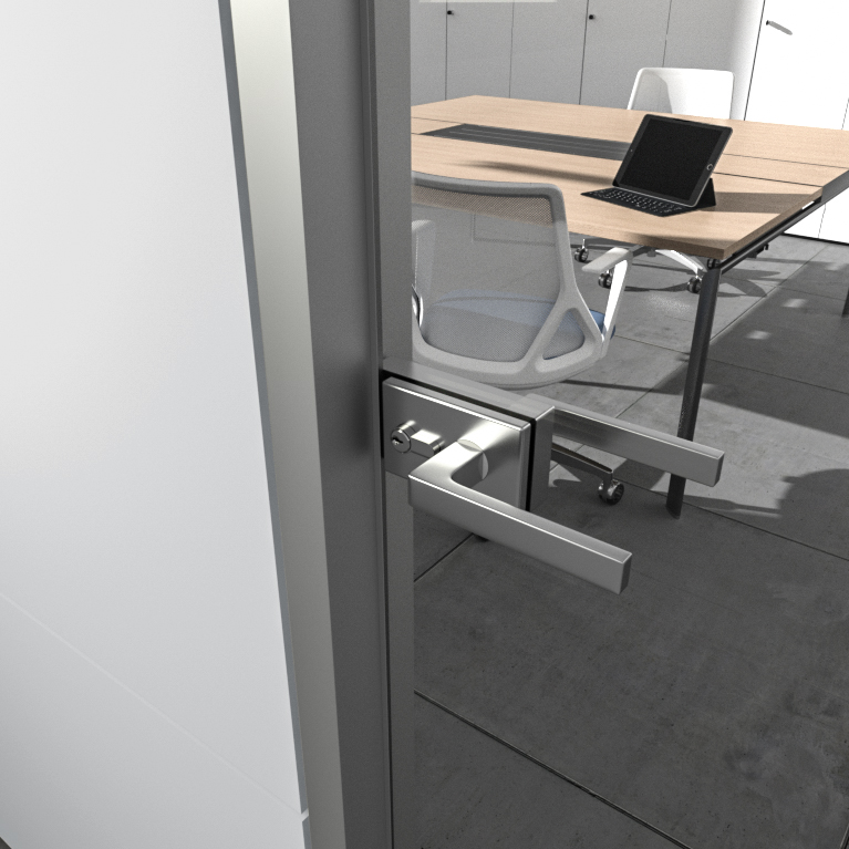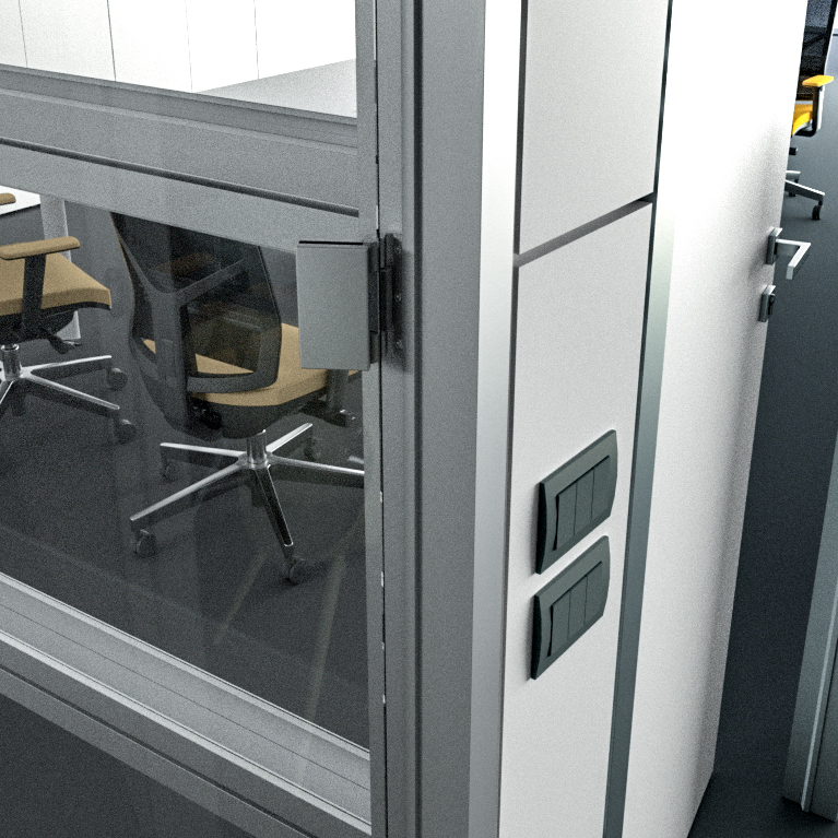 The doors can be hinged or sliding, with 1 or 2 shutters, blind, glass panels framed with aluminum profiles and equipped with safety glass or tempered glass th. 10 mm, all equipped with standard grips and locks. Any wiring for small systems is located inside the wall: data, telephone or electric lines. It is possible to insert mineral fiber mats of various thicknesses and densities inside the blind parts in order to increase the sound insulation features of IDEA walls.