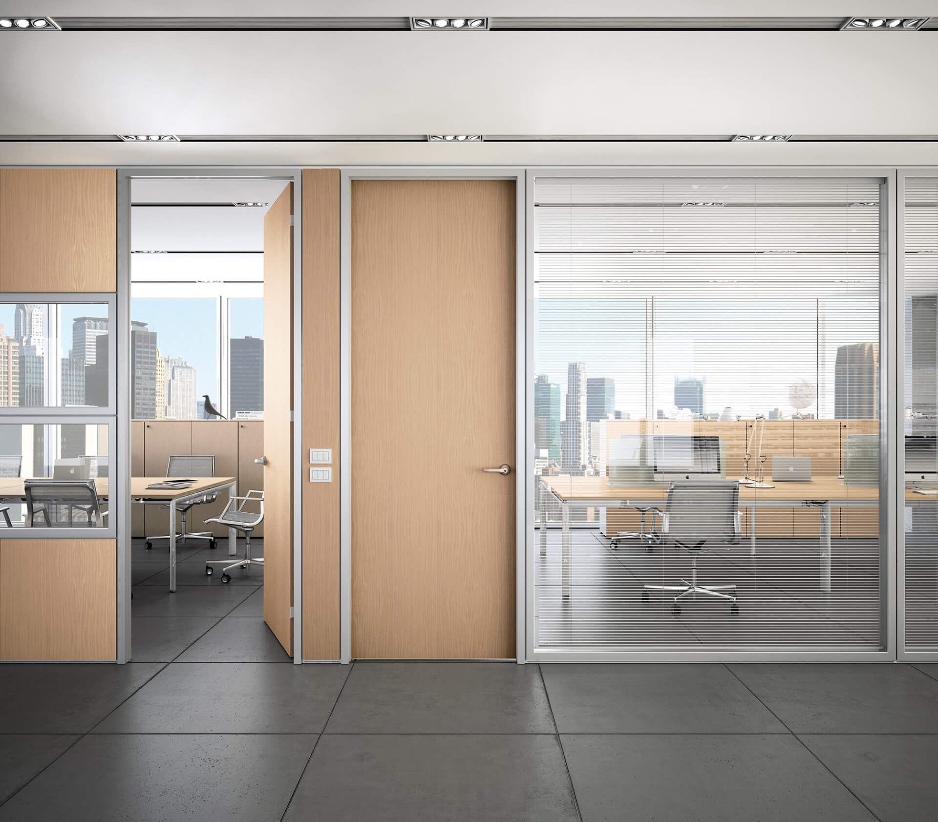 The blind modules are made with 18/19 mm thick faced chipboard panels with standard finishes, edged with 1 mm thick ABS edge, matching the panel finish. The glass parts are made of extruded anodized silver aluminum profiles or painted on request in RAL colors, while the glass, both single and double, are stratified 3 + 3 pvb. 0.38 safety as required by the regulations. Possibility to insert Venetian blinds between the double glass of the wall, with 15 or 25 mm slats and orientation only control.