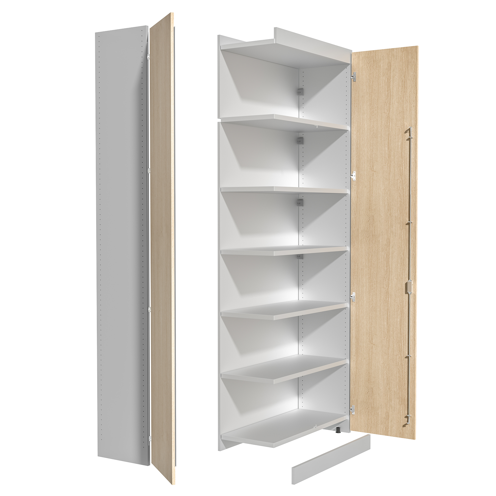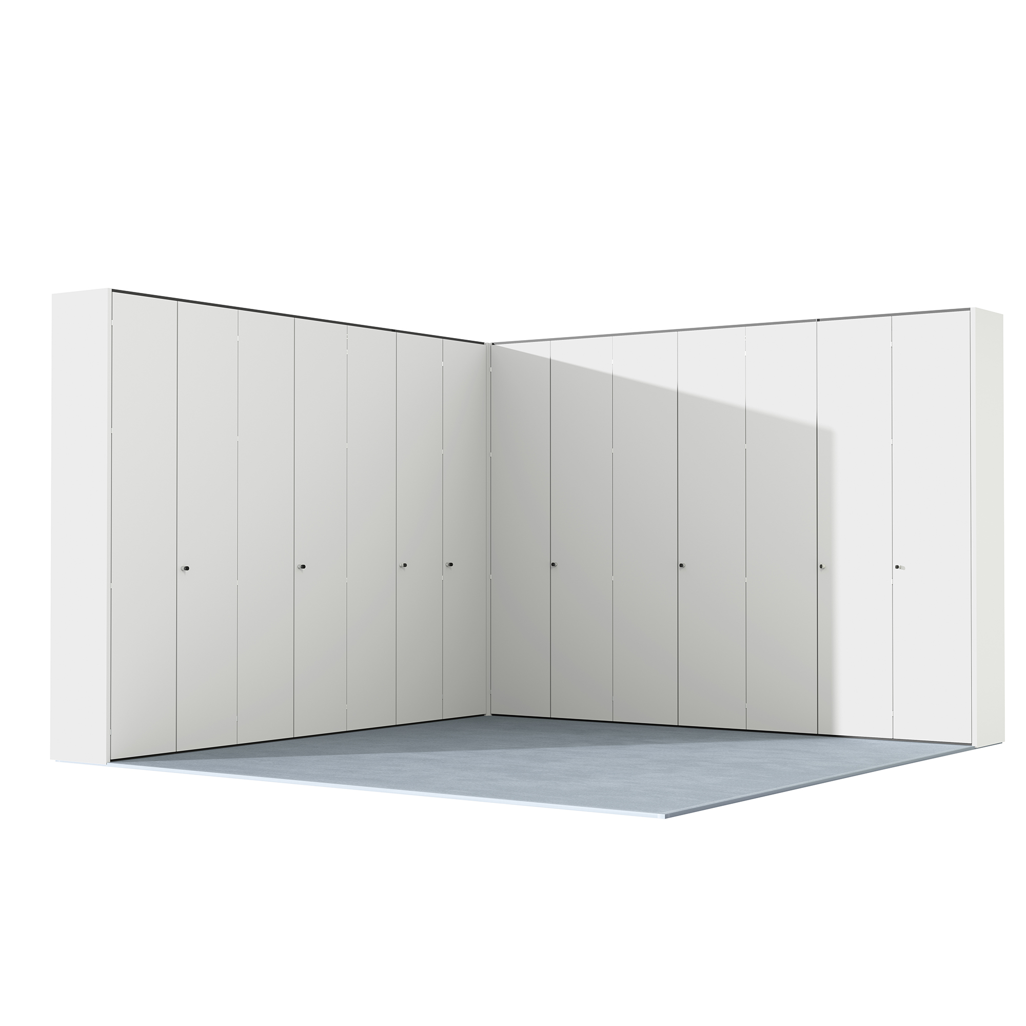 The covering panels (backrests and curtain walls) are also made with 18 mm thick faced chipboard panels with standard finishes, edged with 1 mm thick ABS edge in the same color as the panel finishes, and mounted with RAL 9006 color-shot silver backrests. Thanks to the lower and upper structural bases, the technical compartments are obtained on the ground and on the ceiling for the housing and passage of any wiring, with the possibility of being inspected by dismantling the skirtings and curtain walls.