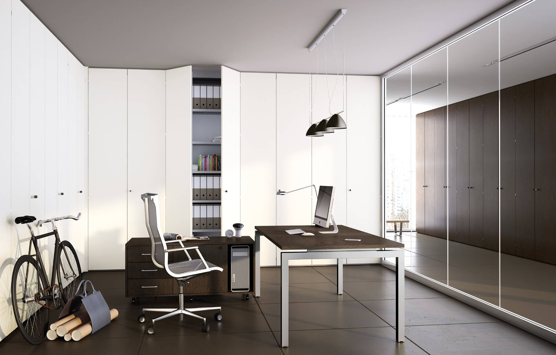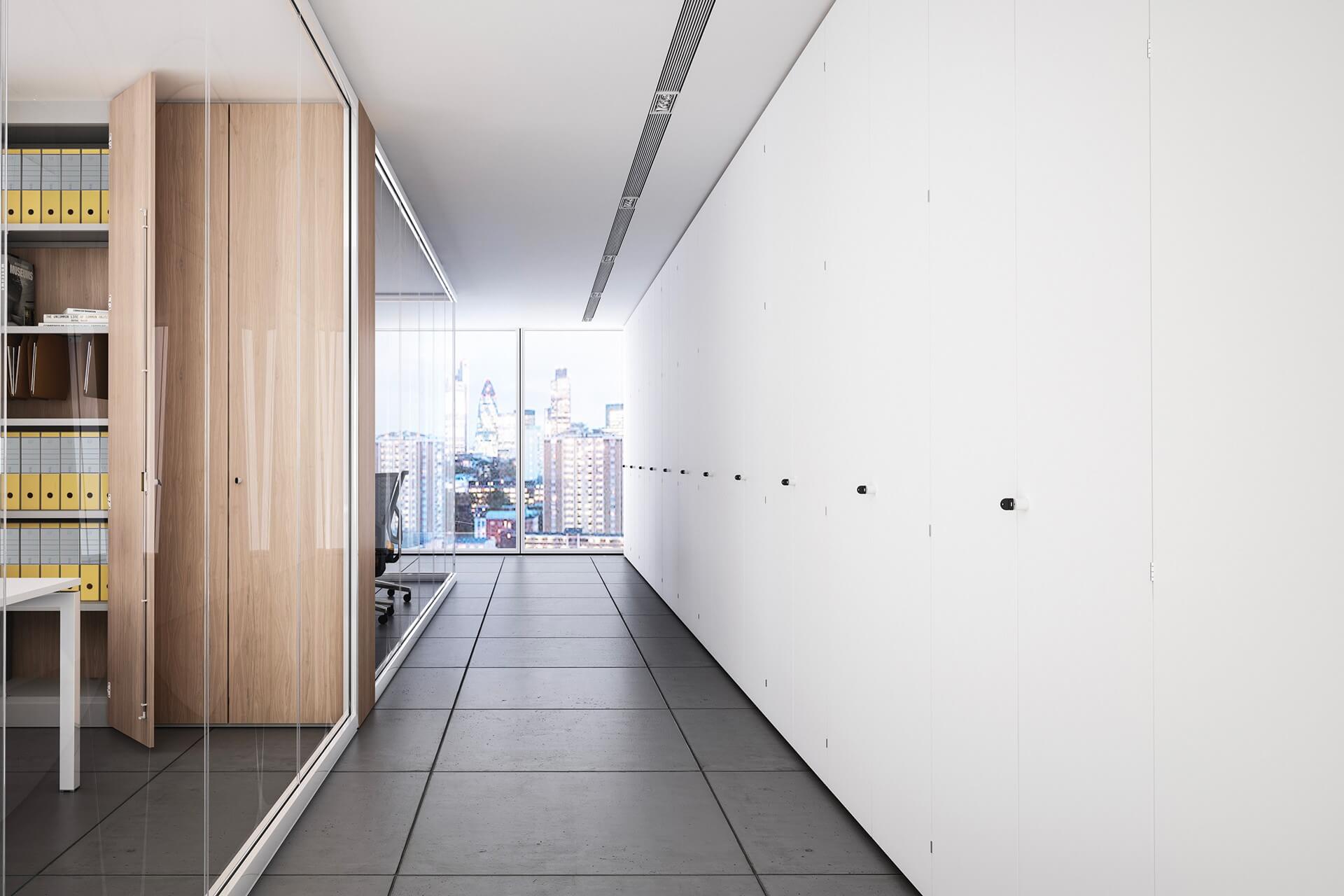 PROXIMA wall unit consists of a supporting structure made of 22 mm thick faced chipboard panels with a silver finish and edged with a double balloon RAL 9006 silver dust-cover. The doors can be either blind or glazed: – blind, made with 18 mm thick faced chipboard panels with standard finishes, edged with 1 mm thick ABS edging in the same color as the glazed panel finishes, in transparent or frosted tempered glass. Hinges with 180° opening and silver color knobs without locks are fitted as standard.