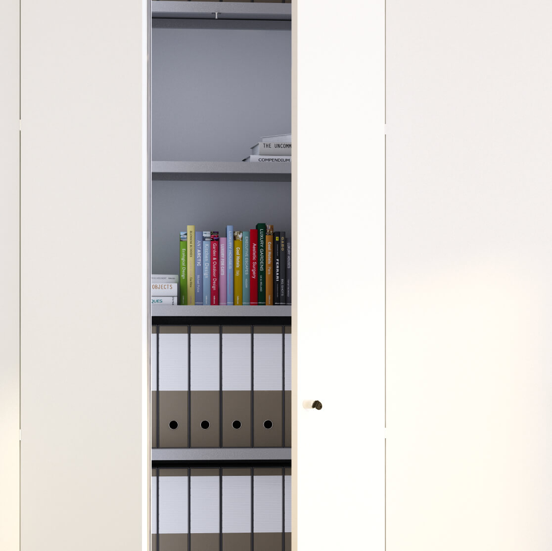 Metal shelves are installed on the inside, adjustable in height thanks to the shelf supports and perforated abutments with vertical holes with 32 mm pitch, prepared for housing suspended files with interaxle spacing of 330 mm. The interiors can be equipped with removable folder holders for hanging files with interaxle spacing of 330 mm, container drawers and various accessories at the discretion of the customer.