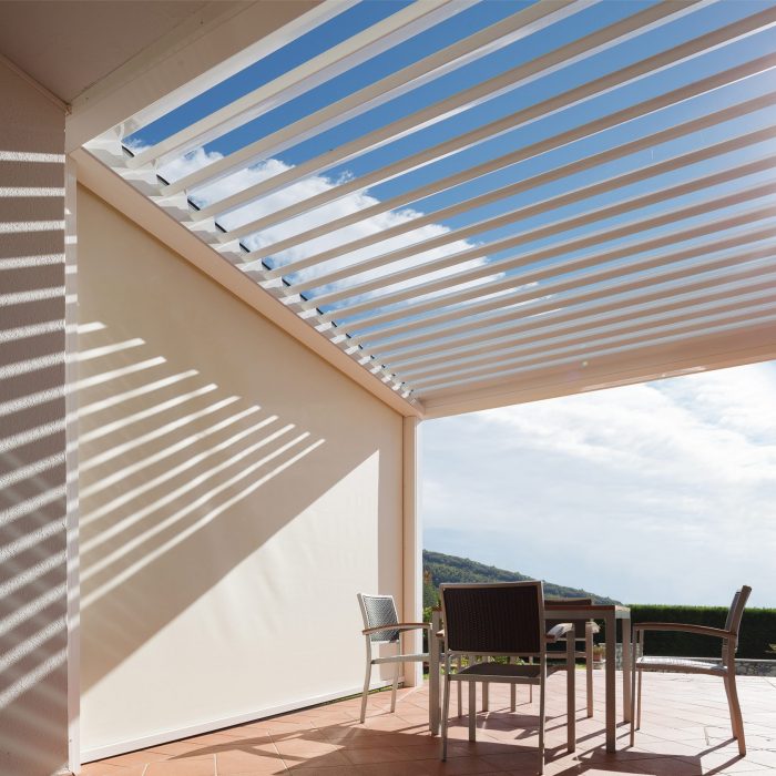 Le pergole bioclimatiche Pratic sono dotate di lamelle in alluminio orientabili fino a 140°, permettendo di regolare la luce naturale e la ventilazione in base alle condizioni climatiche. Questa funzionalità consente di creare un microclima ideale all’interno della struttura, sfruttando in modo intelligente gli elementi naturali come sole e vento.
