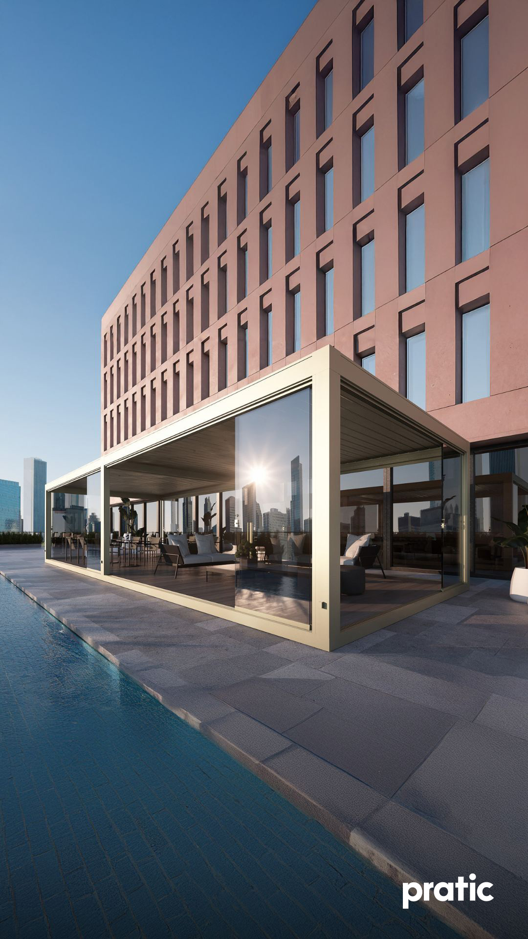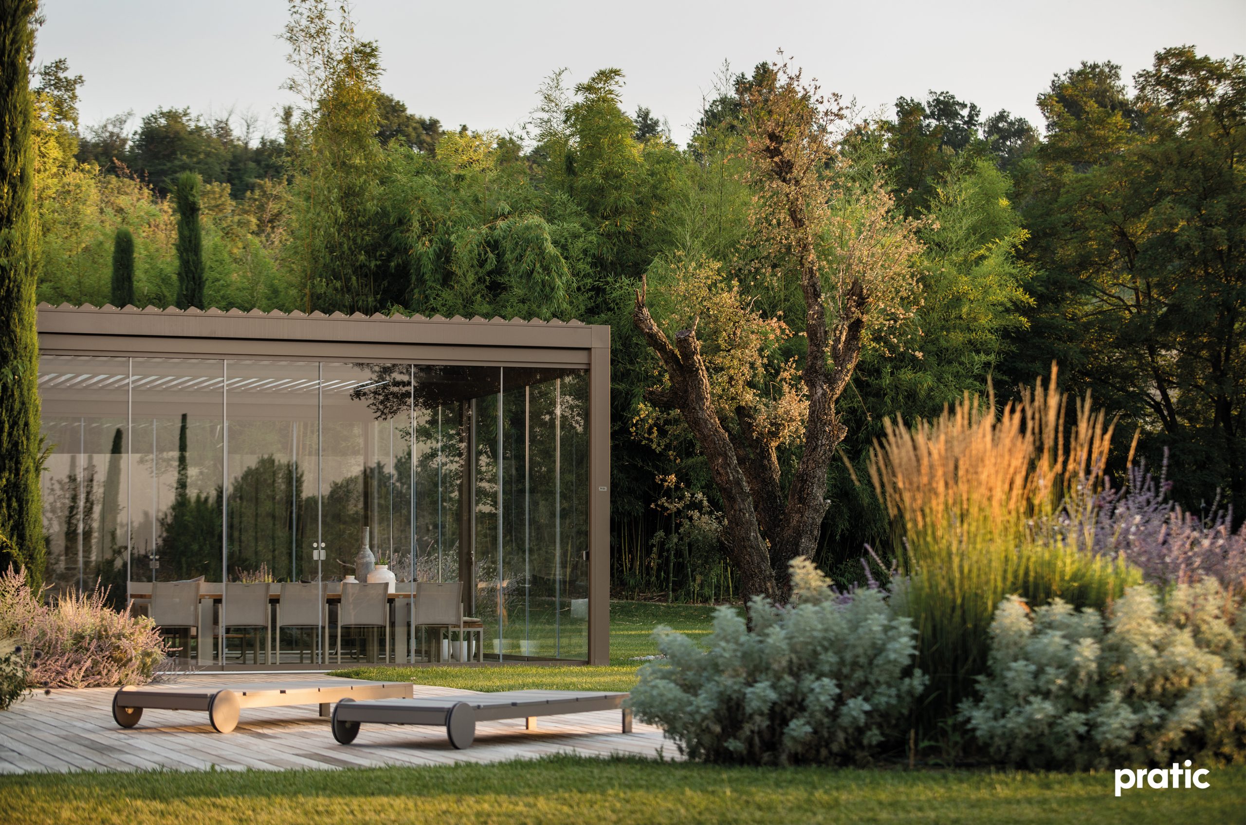 Il design essenziale e moderno delle pergole bioclimatiche Pratic si integra perfettamente in qualsiasi contesto architettonico, con una gamma esclusiva di 38 colori sviluppati da esperti di moda e design. Questa ampia possibilità di personalizzazione consente di creare ambienti raffinati ed eleganti, in linea con le tendenze contemporanee.
